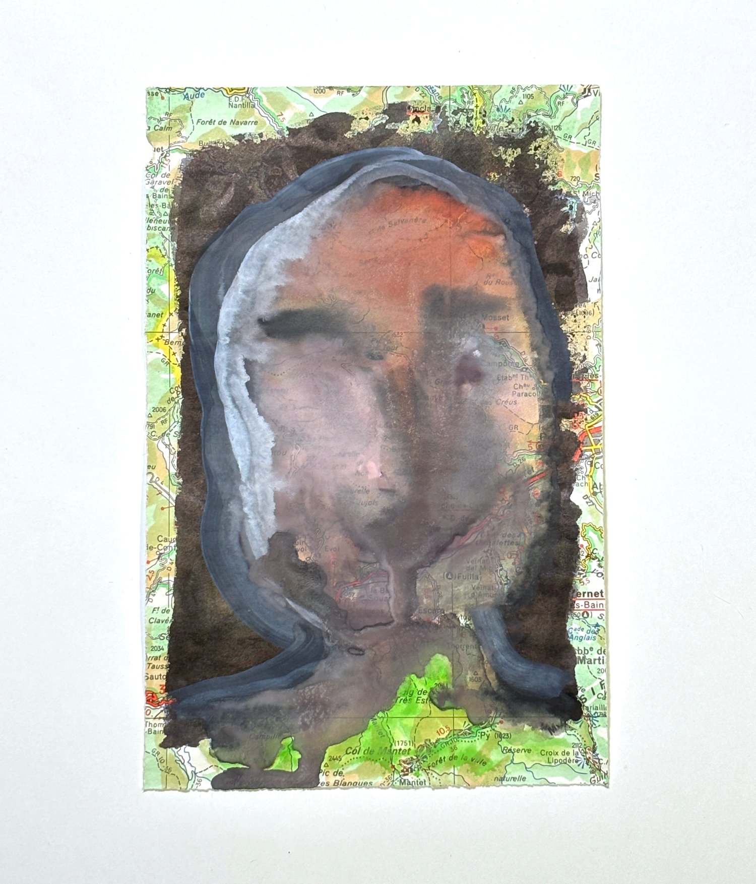 Each watercolor was produced on a hand torn sheet of a discarded map, showing the south of France.